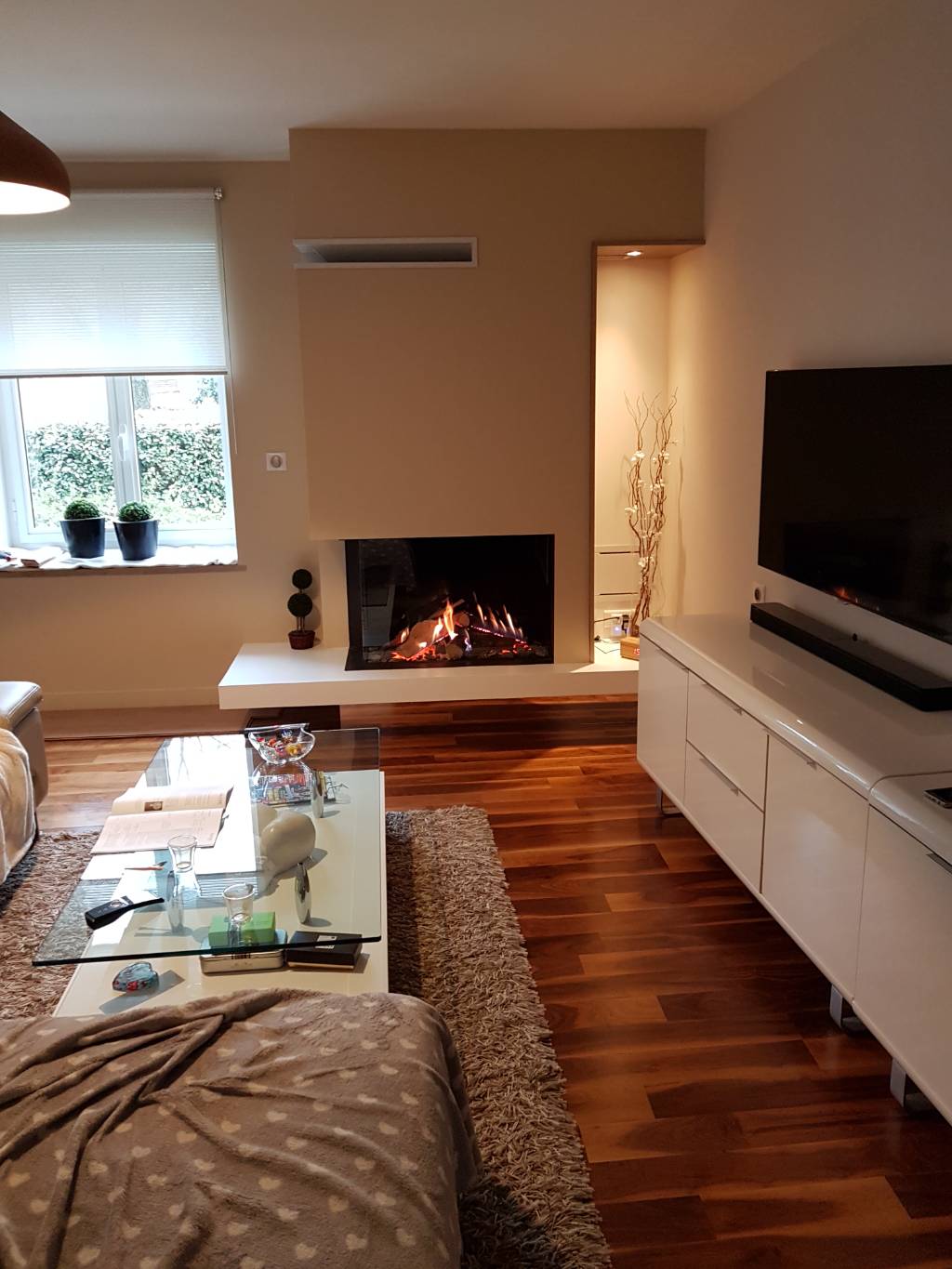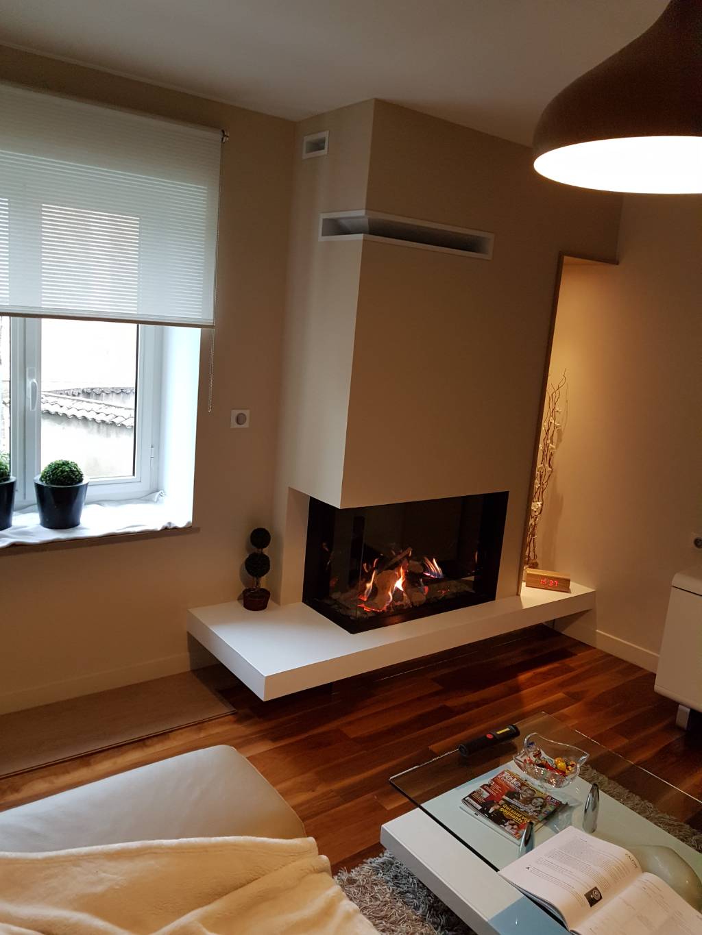 Un miroir a été posé sous le socle, en trompe-l’œil, afin de créer une impression de vide sous le foyer, renforçant l’effet suspendu.