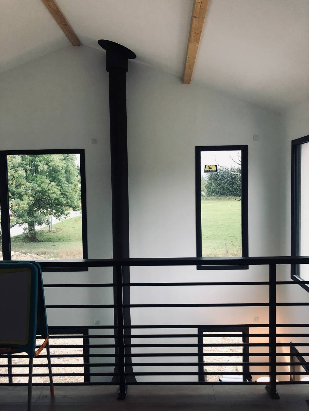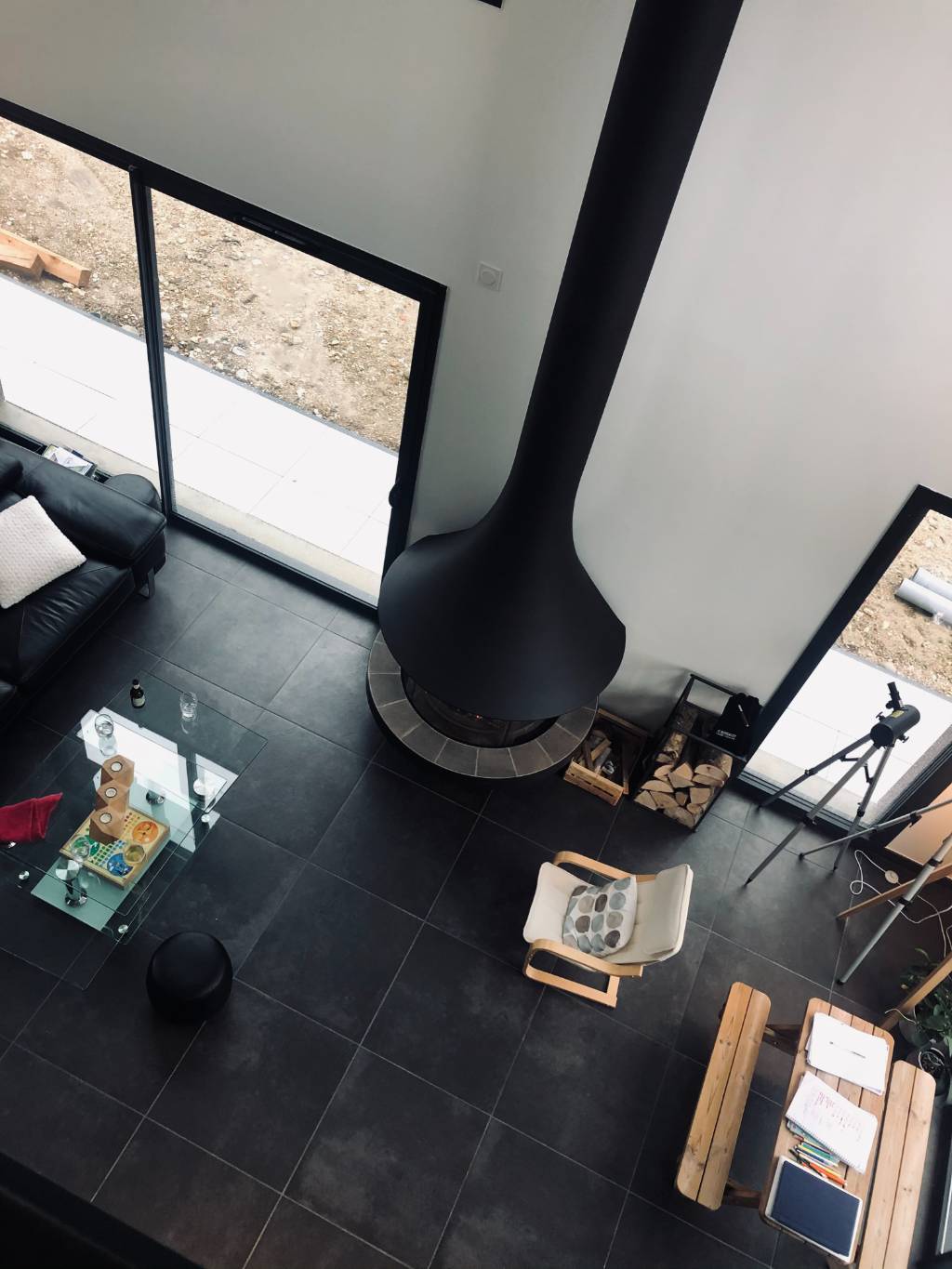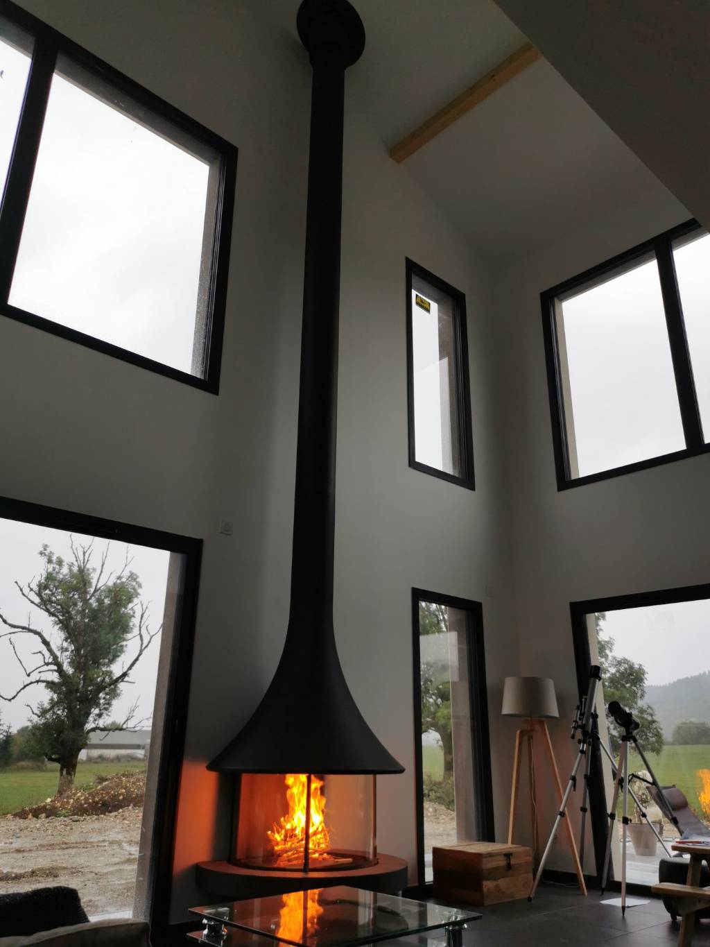 Dans cette maison contemporaine en construction, nichée au pied des montagnes du Haut-Bugey à proximité du plateau d’Hauteville, il fallait une cheminée à la hauteur de la vue exceptionnelle offerte par les immenses baies vitrées.