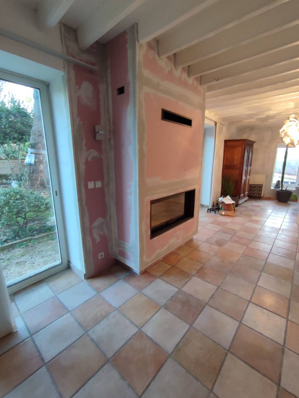 On n’a pas fait les choses à moitié ! Nos équipes ont débarqué au marteau-piqueur pour tout casser proprement, enlever l’ancien foyer et préparer la structure. Puis, ils ont conçu un coffrage complet sur mesure, avec une plinthe de convection intégrée, évitant absolument les grilles visibles en bas – résultat : une finition élégante et contemporaine.
